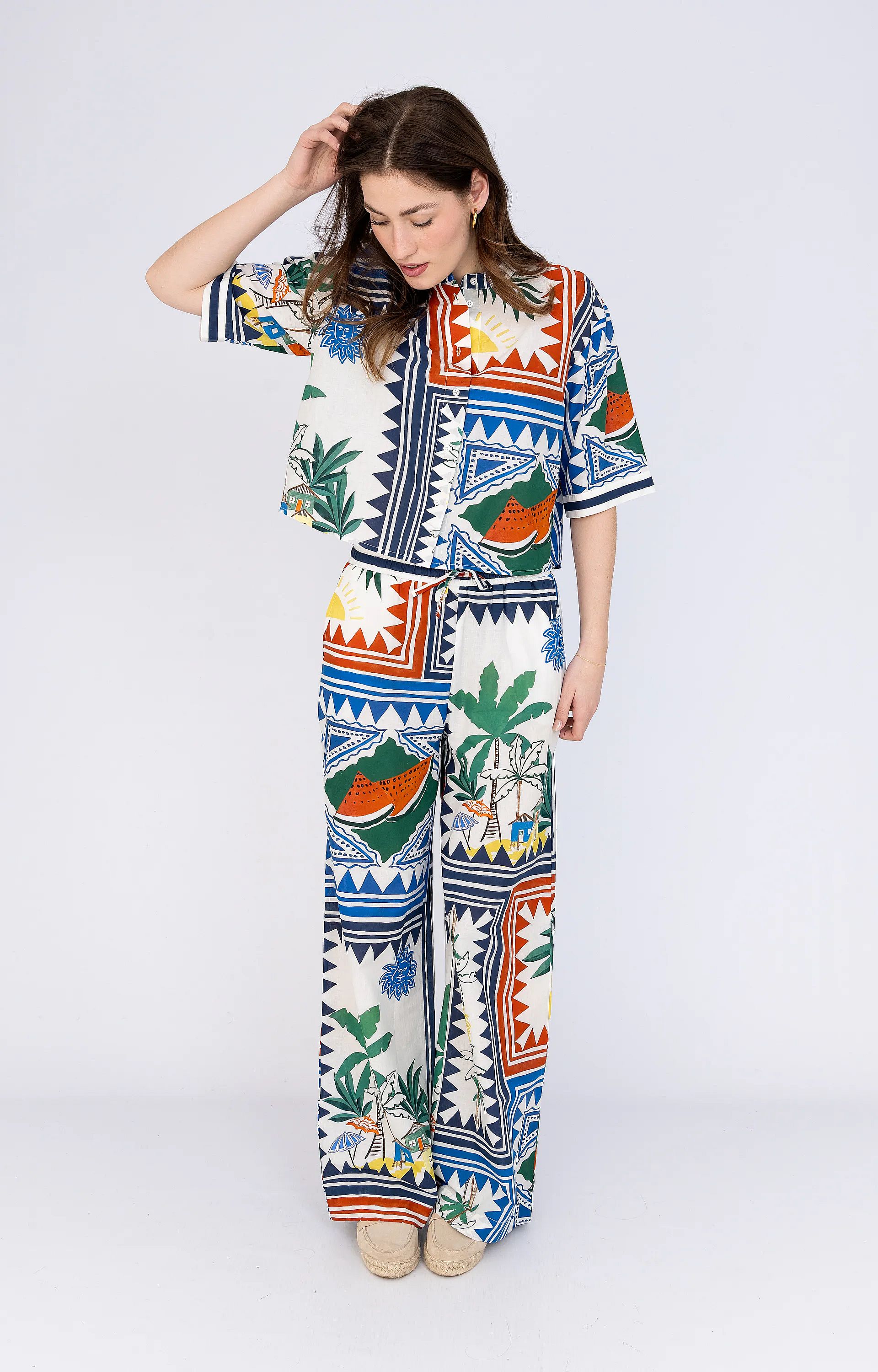 Deze Anna Blue blouse is gemaakt van katoen en is prettig om te dragen tijdens zomerse dagen. De blouse heeft een gekleurde print die zorgt voor een opvallend geheel. De kortere pasvorm combineert goed met een high-waist broek of rok. De knoopsluiting aan de voorzijde zorgt voor een praktische afwerking. Korte mouwen maken de blouse luchtig en comfortabel.