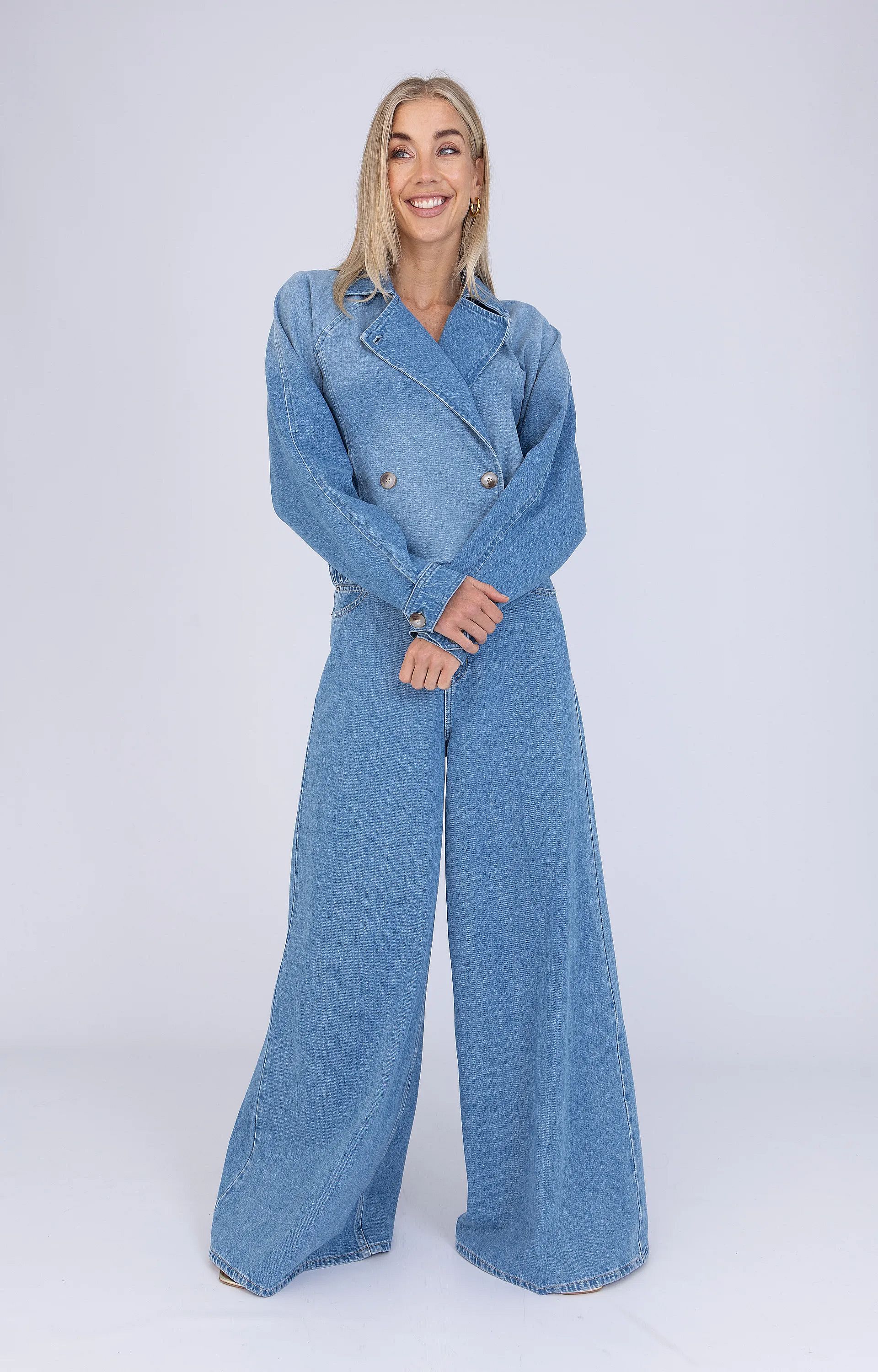 Dit denim jack van Anna is een eigentijdse toevoeging aan je zomergarderobe. Het model heeft een korte, cropped lengte en een overslag met dubbele knoopsluiting, wat zorgt voor een moderne twist op een klassiek ontwerp. De lichte denimkleur maakt het jack makkelijk te combineren, terwijl de elastische tailleband achter een subtiel bloezend effect geeft. Gemaakt van katoen met een vleugje stretch voor een comfortabele pasvorm.