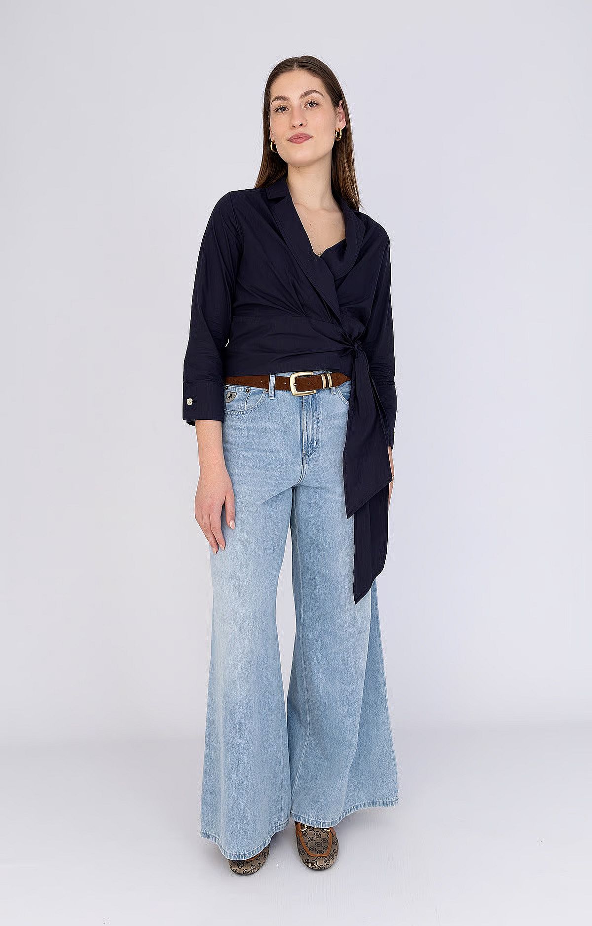 Deze donkerblauwe wikkelblouse van Anna is een stijlvolle en vrouwelijke toevoeging aan je zomergarderobe. De blouse is vervaardigd uit hoogwaardig katoen, heeft een normale pasvorm en is voorzien van een flatterende wikkelvorm met striksluiting in de taille. De klassieke kraag en de elegante gouden manchetknopen geven dit ontwerp een verfijnde uitstraling. Ideaal voor zowel zakelijke als casual gelegenheden.