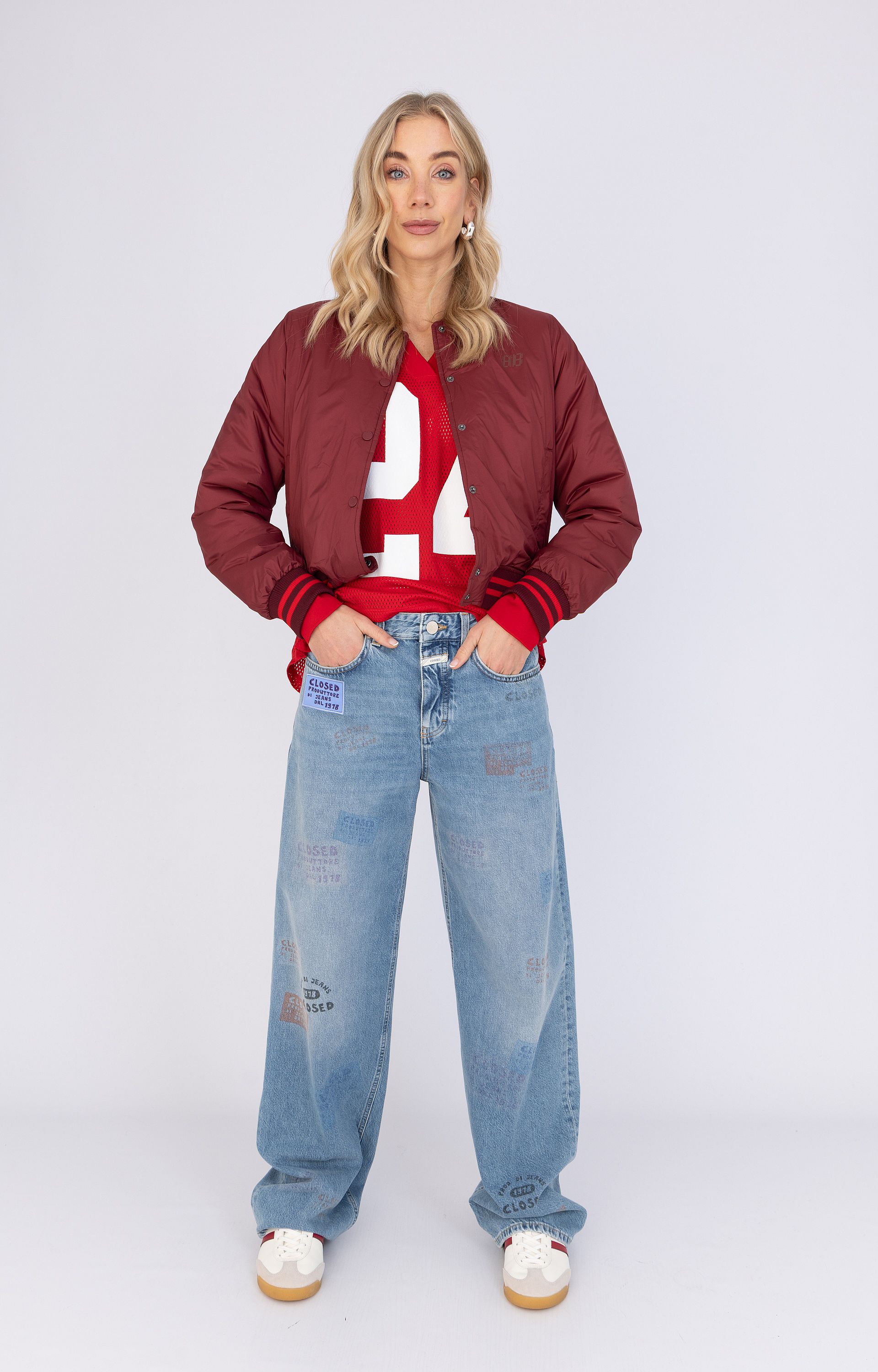 Details: Gouden ronde studs, gesp, puntige neus