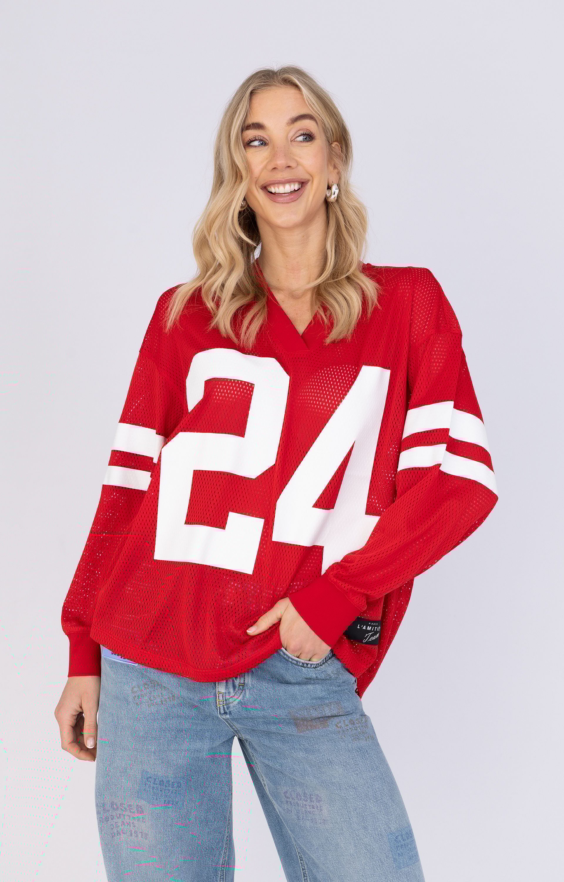 – Kleur: Denim met opdruk