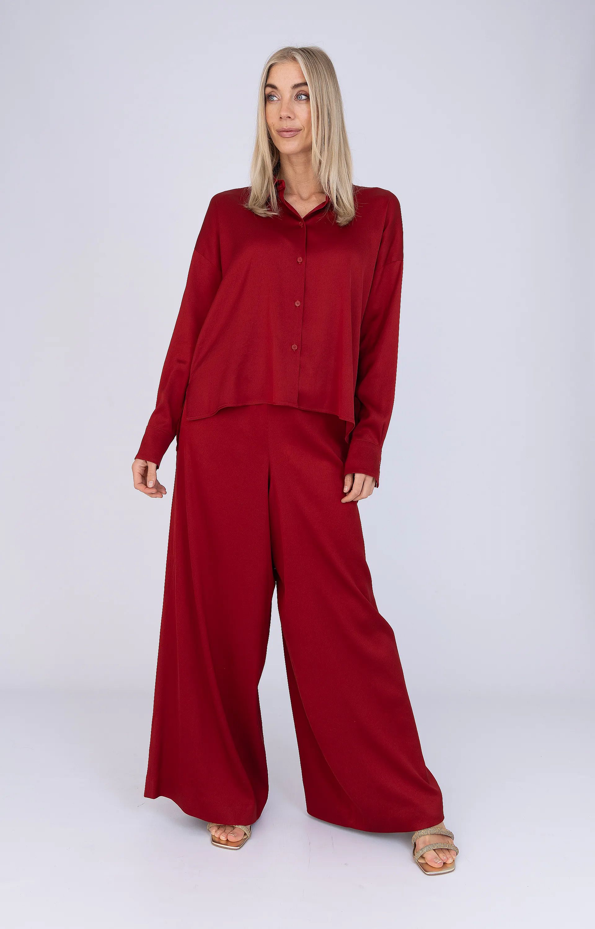 CLOELIA van Drykorn is een klassieke overhemdblouse in een rijke rode kleur. De blouse is gemaakt van soepel satijn met acetaat en elastaan voor extra draagcomfort. Het model heeft een klassieke pasvorm met een iets langere ruglengte. Afgewerkt met een overhemdkraag, lange mouwen en knoopsluiting aan de voorzijde. Geschikt voor zakelijke en alledaagse combinaties in het zomerseizoen.