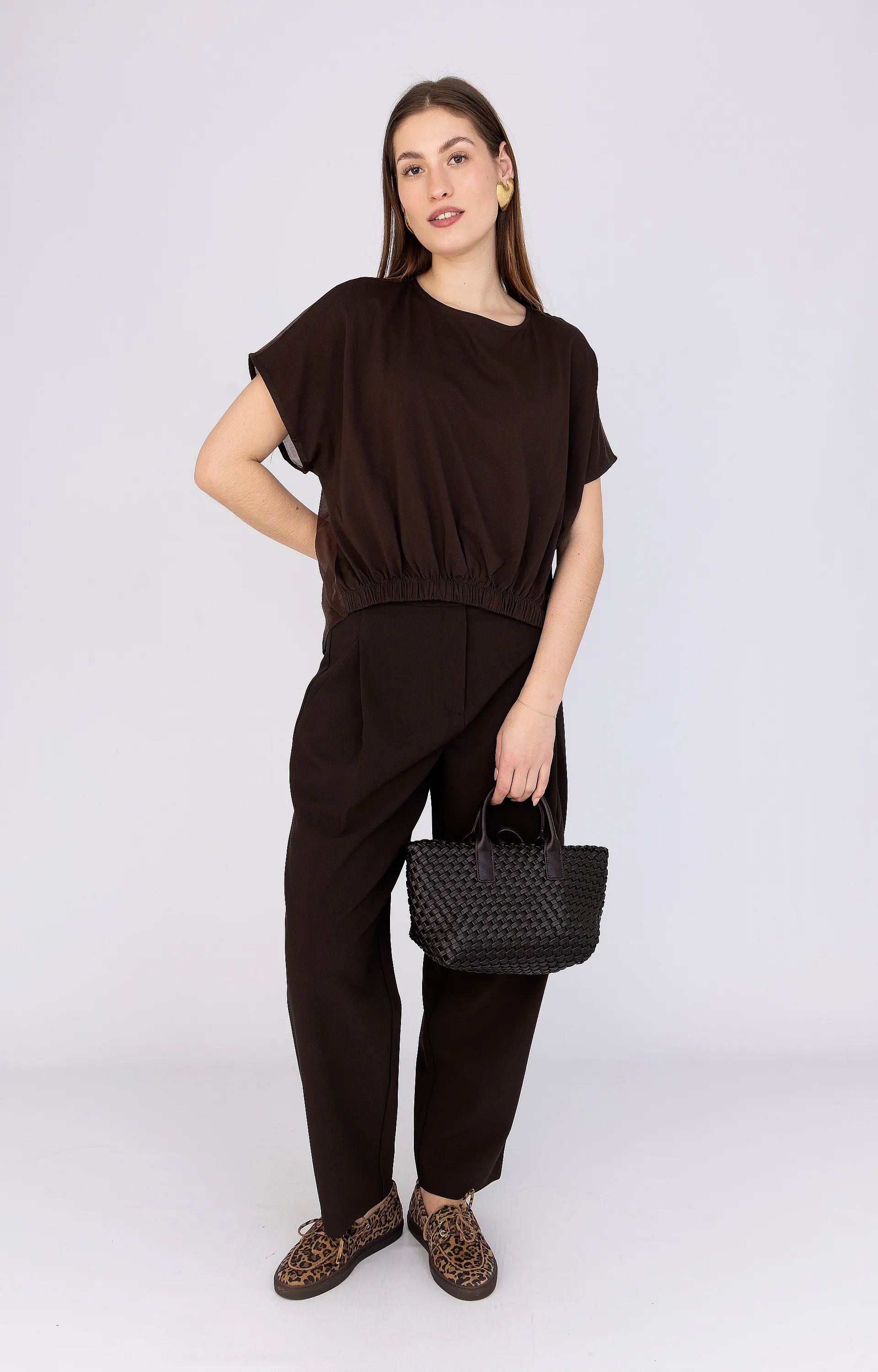 Deze blousetop van Meme Road is uitgevoerd in een bruine kleur en gemaakt van een luchtige mix van katoen, lyocell en polyester. De top heeft een normale pasvorm en een elastische taille voor een comfortabele fit. De ronde halslijn sluit aan de achterzijde met een klein knoopje. De achterkant is deels transparant, wat zorgt voor een subtiel contrast met de dichte voorkant. Ideaal voor zomerse dagen.
